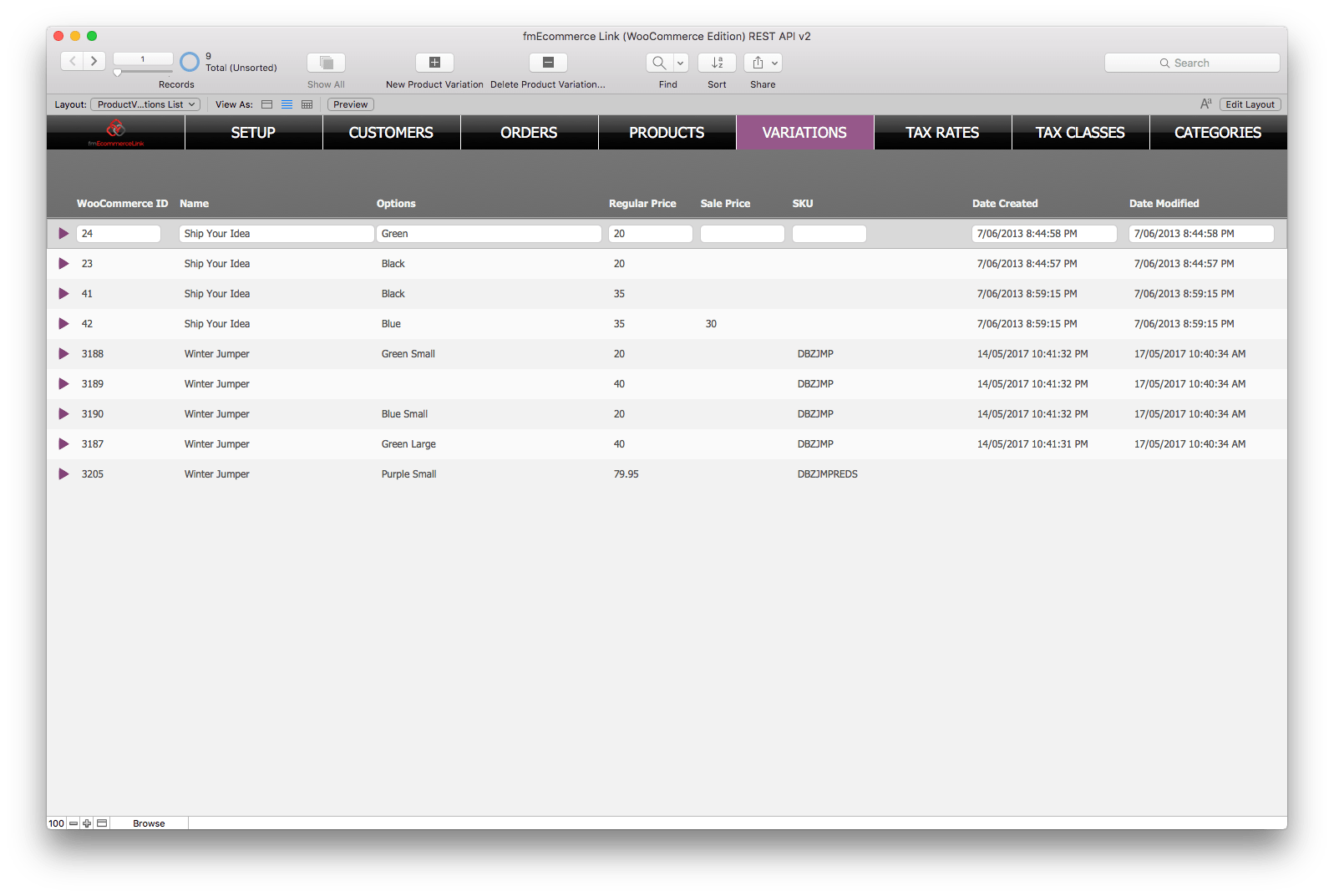 Yes – you can download, update and upload Product Variations. In the fmEcommerce Link (WooCommerce Edition) REST API v1.fmp12 file each Product Variation is another record in the Products table linked to the parent/master Product record. You can set the same attributes that you can via WooCommerce: