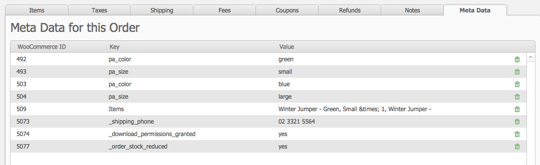 If you have Meta Data associated with a WooCommerce record, such as a Customer, Product or Order and you wish to delete this from WooCommerce you must clear out the values for the Meta Data and upload that to WooCommerce and pass a null value. You cannot delete the Meta Data records in fmEcommerce Link and upload that to WooCommerce as it will not delete the Meta Data that exists; furthermore you cannot delete all existing Meta Data by simply uploading an empty array like this: