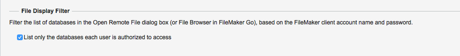 This simply makes a connection to the FileMaker Server (you can change the 127.0.0.1 hostspec address if required) and calls the PHP API listDatabases method – this returns an array of databases that are available with the current server settings and the current user name and password credentials. You will notice that I have not included a FileMaker database Account Name and Password – this will only work when the setting in the FileMaker Server Admin Console List only the databases each user is authorized to access is NOT selected (found under Database Server > Security > File Display Filter).